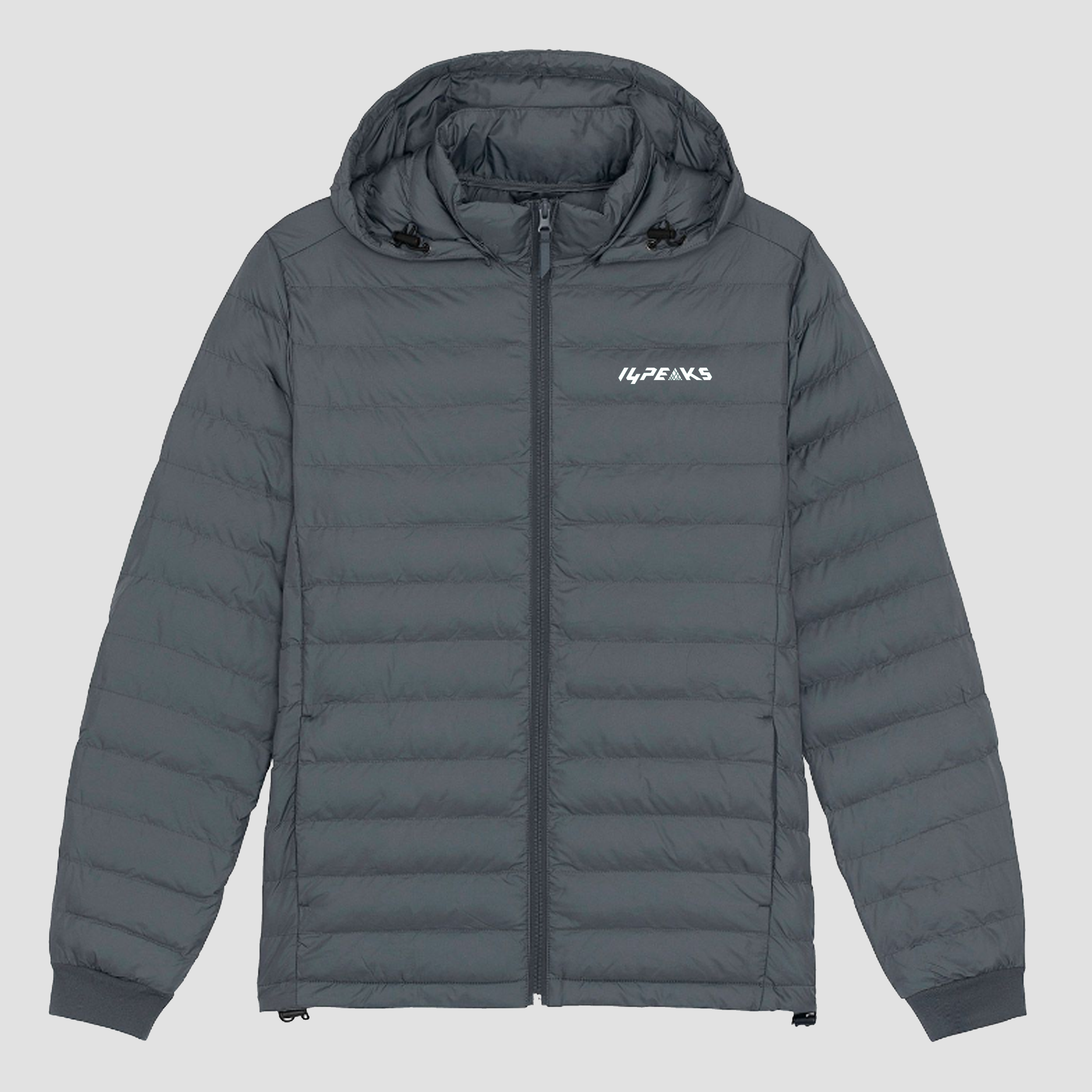 Men’s padded jacket. Medium fit. Set-in sleeve. High collar with a grown-on hood. Adjustable hood opening and bottom hem with plastic stopper and elastic cord. Reverse nylon zip at centre front. Zipped welt pockets with extra grosgrain puller. Fully quilted. Side panels for a better shape. Self-fabric elasticated cuff. Inside seams with binding finish.